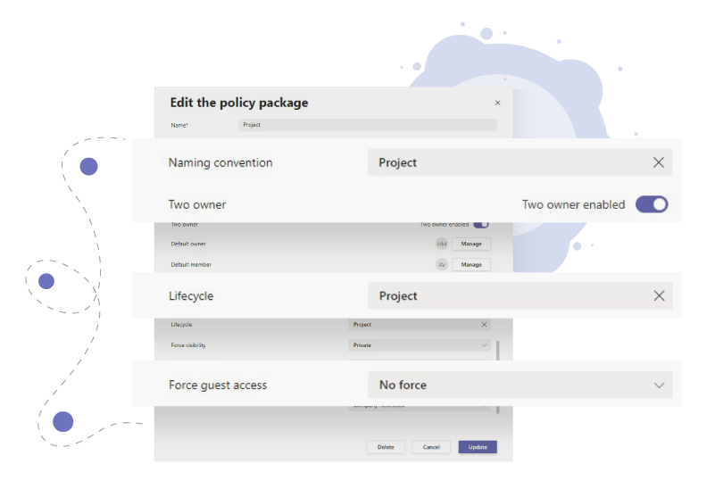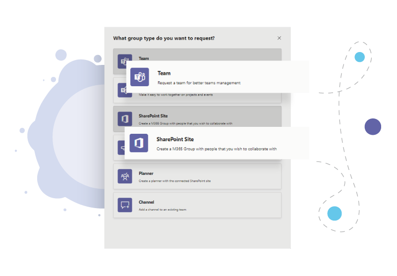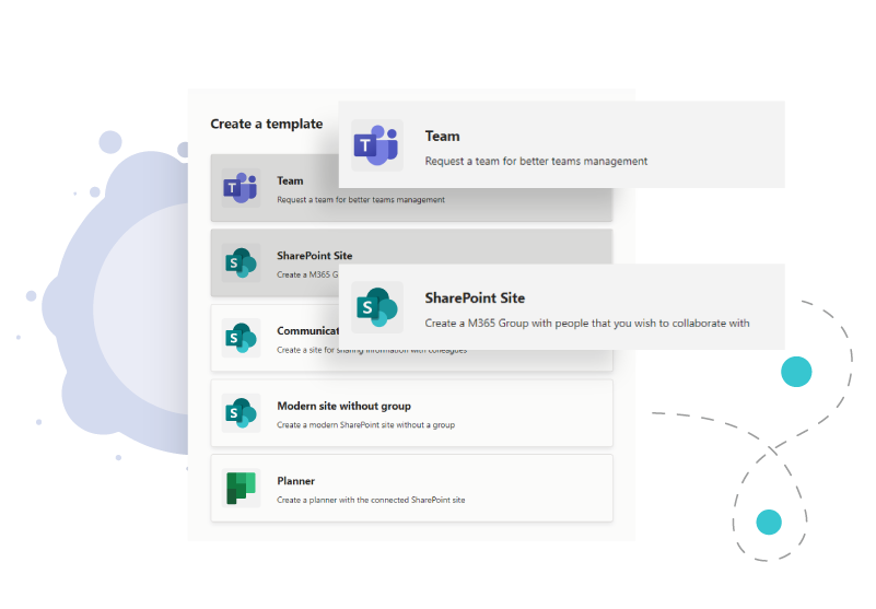 Definition von Optionen für die Endbenutzer zur Erstellung von Teams und SharePoint Sites. Richtlinien wie Namenskonventionen, Lebenszyklus, Sensitivity Labels und Gastzugriffsberechtigungen werden definiert und sind für die Endbenutzer vorgegeben. Damit sind sowohl Sicherheit als auch Governance auf Ihrem Tenant gewährleistet.