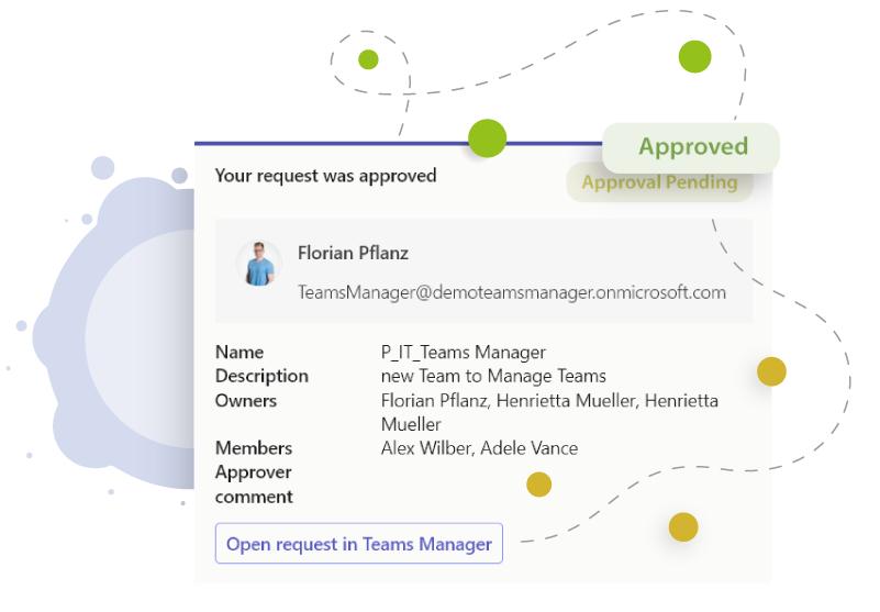 Die Teams Manager-App bietet einen automatisierten Workflow, mit dem alle Anfragen für neue Teams einfach überprüft und genehmigt werden. Damit ist die Erstellung von Beginn an geführt und die User nutzen die Teams Umgebung wie gewohnt.